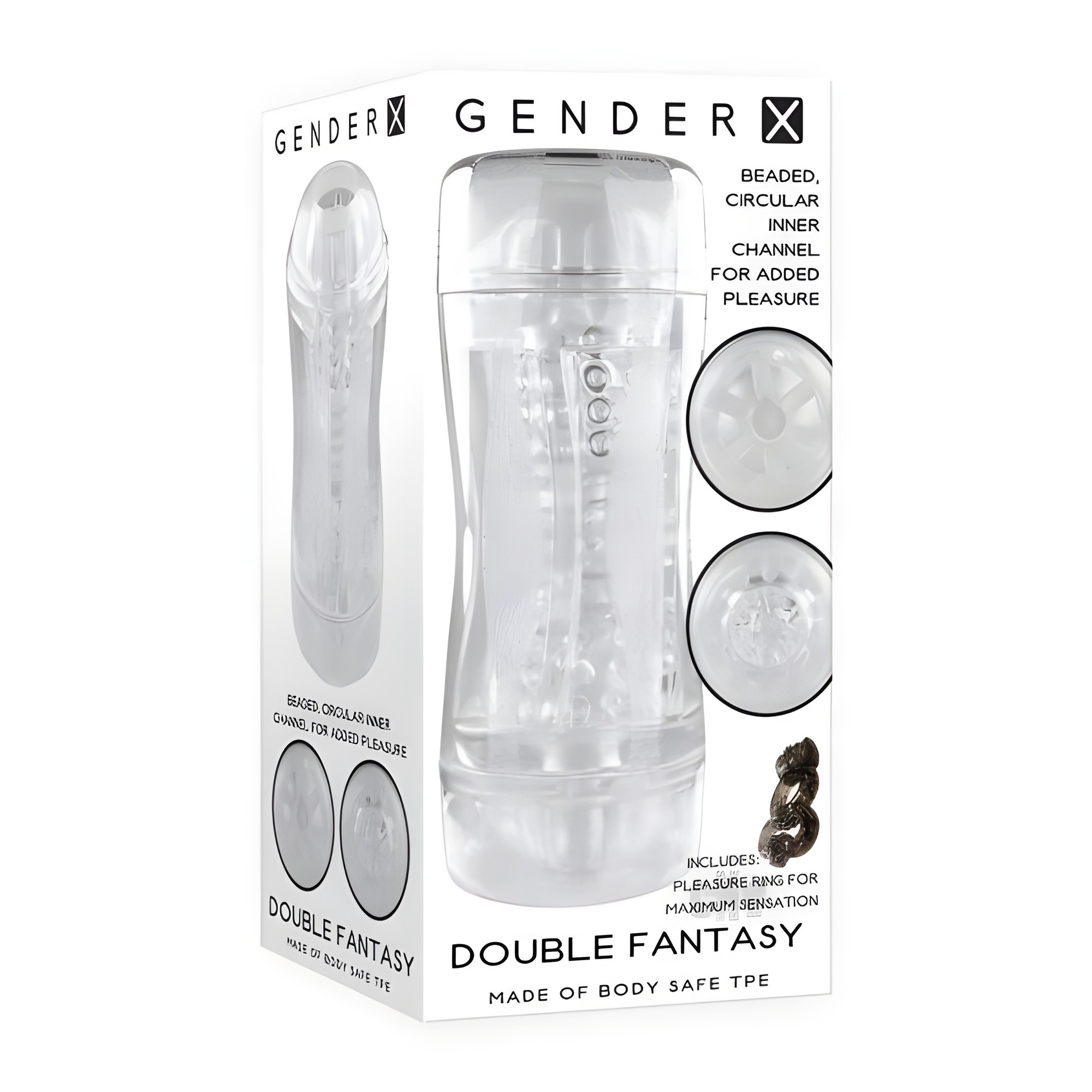 Unleash dual pleasure with the Gx Double Fantasy Clear stroker.