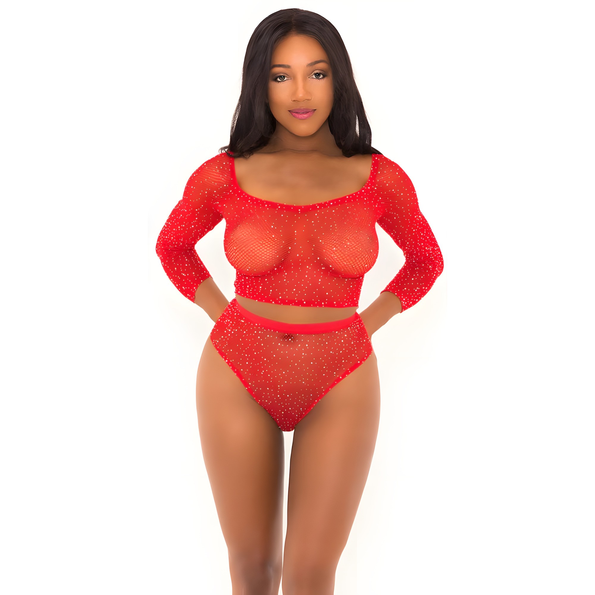 Haz una declaración con el Top Corto con Rhinestones que presenta copas de malla transparente y un panty a juego de cintura alta.